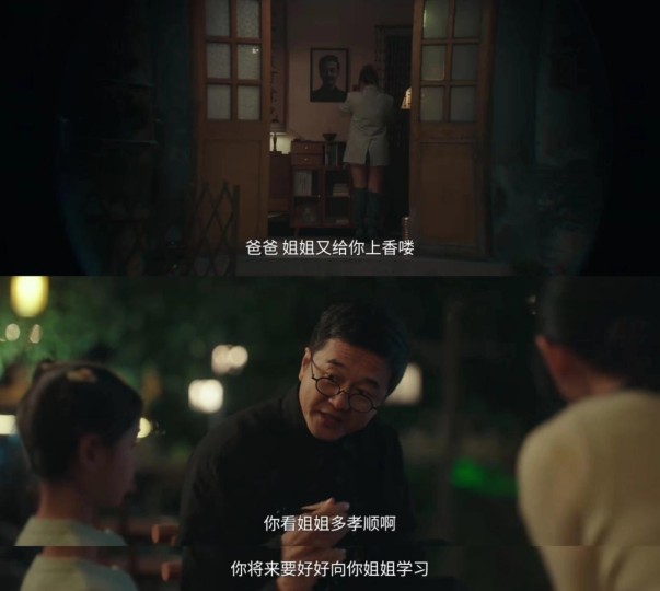 就连邻居家都全是戏。得宝叔前妻和现任住对门,前妻在家里挂他遗像,每天可以看到大女儿对自己上香,得宝叔还教育小女儿要学习姐姐的孝顺。